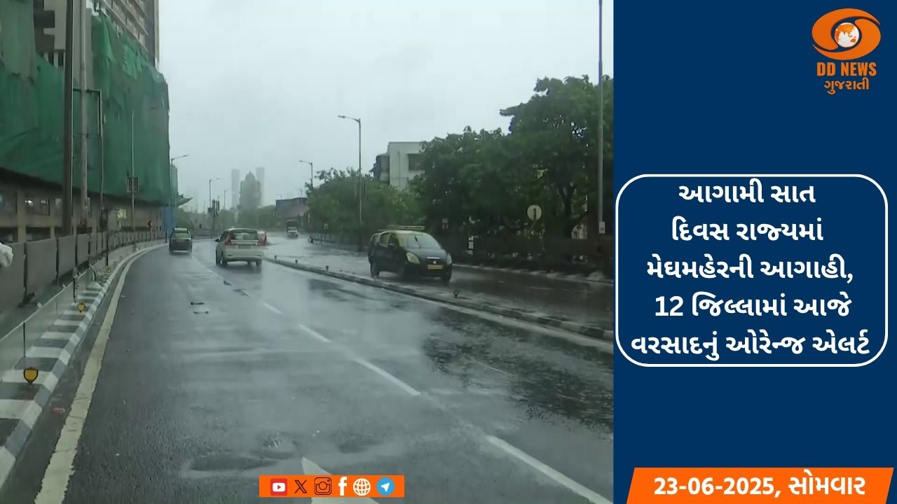 ગુજરાતમાં તારીખ 16મી જૂને ચોમાસાનો સતાવાર પ્રવેશ થયા બાદ આઠ દિવસમાં જ આખા રાજ્યને કવર કરી લીધું છે. આઠ દિવસમાં રાજ્યમાં સિઝનનો સરેરાશ 16 ટકા વરસાદ વરસી ચૂક્યો છે. હવામાન વિભાગે આગામી સાત દિવસ રાજ્યમાં મેઘમહેરની આગાહી કરી છે. હવામાન વિભાગે આજે 23 જૂનના રોજ 12 જિલ્લામાં વરસાદનું ઓરેન્જ એલર્ટ આપ્યું છે. અમરેલી, ભાવનગર, બોટાદ, અરવલ્લી, મહીસાગર, આણંદ, પંચમહાલ, દાહોદ, વડોદરા, ભરૂચ, નવસારી અને વલસાડમાં ભારે વરસાદની આગાહી કરવામાં આવી છે. રવિવારે પણ રાજ્યમાં મેઘરાજાની ધમાકેદાર બેટિંગ જોવા મળી હતી. 150થી વધુ તાલુકાઓમાં વરસાદે હાજરી પુરાવી હતી. જામનગરના જોડીયા તાલુકામાં સાત ઈંચ તો બનાસકાંઠાના અમીરગઢમાં પાંચ ઈંચ વરસાદ વરસ્યો હતો. જામનગર, જૂનાગઢ સહિતના જિલ્લાઓમાં ભારે વરસાદના કારણે સ્થાનિક નદીઓમાં નવા નીરની આવક થઈ છે તો ક્યાંક પૂરની સ્થિતિ પણ જોવા મળી હતી. રાત્રિના 10 વાગ્યા બાદ સુરતમાં પણ મેઘરાજાની ધમાકેદાર બેટીંગ શરૂ થતા ગણતરીની મિનિટોમાં જ રસ્તાઓ પાણી પાણી થયા હતા.