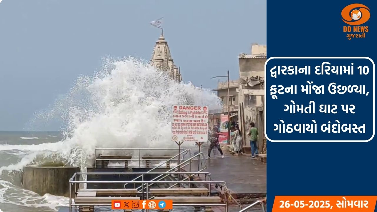 કૃષ્ણનગરી દ્વારકાના પવિત્ર ગોમતી ઘાટ પર 10 ફૂટ સુધી મોજા ઉછળ્યા હતા. સાથે સાથે ગોમતી ઘાટ પર સહેલાણીઓનો જમાવડો જામ્યો હતો. જેને કારણે સ્થાનિક પાલિકાની ફાયર ટીમ, પોલીસ બંદોબસ્ત સાથે પ્રવાસીઓ નાહવા ન પડે તે માટે તૈનાત કરવામાં આવી છે. ગોમતીના જૂના ઘાટો પર ઊભા રહેવું મુશ્કેલ બન્યું હતું..આખરનો સમય અને અમાસ હોવાથી દરિયામાં કરંટ દેખાયો હતો.