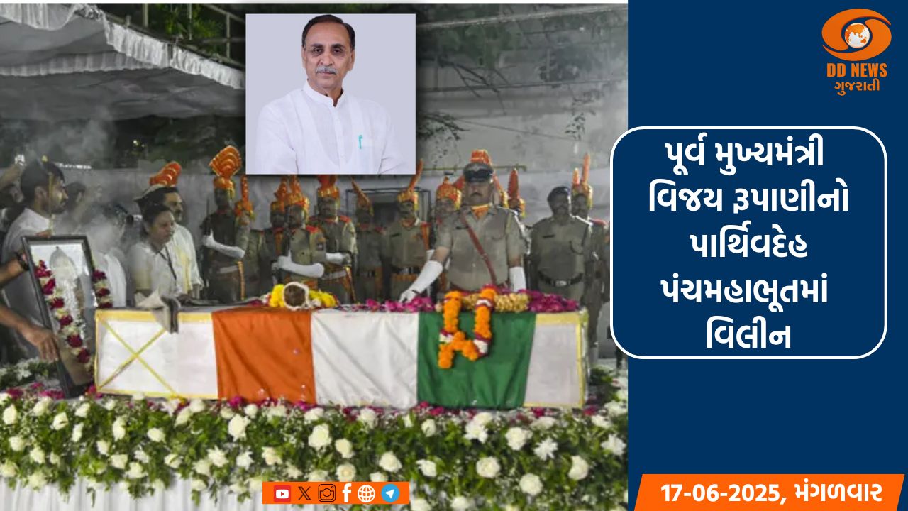 ગુજરાતના પૂર્વ મુખ્યમંત્રી વિજય રૂપાણીજીનો પાર્થિવ દેહ પંચમહાભૂતમાં વિલીન થયો છે. સ્વર્ગીય વિજય રૂપાણીના ધર્મપત્ની અંજલિબેન રૂપાણી તેમજ પુત્ર-પુત્રી સહિત સ્વજનો ભીની આંખે અને ભારેે હૈયૈ દિવંગત વિજય રૂપાણીને અંતિમ વિદાય આપી હતી. અંતિમ સંસ્કાર અગાઉ સંપૂર્ણ રાજકીય માન સન્માન સાથે પૂર્વ મુખ્યમંત્રીને ગાર્ડ ઓફ ઓનર આપીને અંતિમ વિદાયમાન આપવામાં આવ્યું હતું. તે અગાઉ કેન્દ્રીય ગૃહમંત્રી અમિત શાહ, રાજ્યપાલ આચાર્ય દેવવ્રત, પ્રદેશ પ્રમુખ અને કેન્દ્રીય મંત્રી સી.આર. પાટીલ તેમજ મુખ્યમંત્રી ભૂપેન્દ્ર પટેેલ, પૂર્વ નાયબ મુખ્યમંત્રી નીતિન પટેલ સહિત રાજકોટ ભાજપના નેતાઓએ સ્વર્ગીય વિજય રૂપાણીને શ્રદ્ધાંજલિ અને પુષ્પાંજલિ અપર્ણ કરી હતી. રાજકોટના રેડક્રોસ મેદાન ખાતે આજે 17 જૂનના રોજ દિવંગત વિજય રૂપાણીને શ્રદ્ધાંજલિ આપવા બપોરે 3થી 6 વાગ્યા સુધી પ્રાર્થનાસભાનું આયોજન કરવામાં આવ્યું છે.