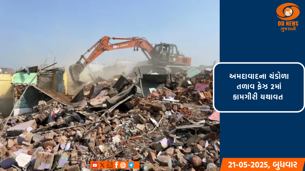 ચંડોળા તળાવ ફેઝ-2 ડિમોલિશન આગામી થોડા દિવસો સુધી ચાલશે. AMC અને પોલીસની ટીમો સતત મોનિટરિંગ કરી રહી છે.ચંડોળા તળાવ વિસ્તારમાં ડિમોલિશનની લગભગ 99.99 ટકા કામગીરી પૂર્ણ થઈ છે.હવે કાટમાળ ખસેડવાની કામગીરી કરવામાં આવશે. જે આગામી 15-20 દિવસ સુધી ચાલશે.ફેઝ 1માં 1.5 લાખ ચોરસ મીટર જમીન પરથી દબાણ દૂર કરવામાં આવ્યું. જ્યારે ફેઝ 2માં 2.5 લાખ ચોરસ મીટર જમીન પરથી દબાણ દૂર કરાયું છે. કૂલ 15 હજાર જેટલા ગેરકાયદે કાચા-પાકા મકાનો તોડી પાડવામાં આવ્યા છે. ચુસ્ત પોલીસ બંદોબસ્ત વચ્ચે આ કામગીરી કરવામાં આવી હતી.
