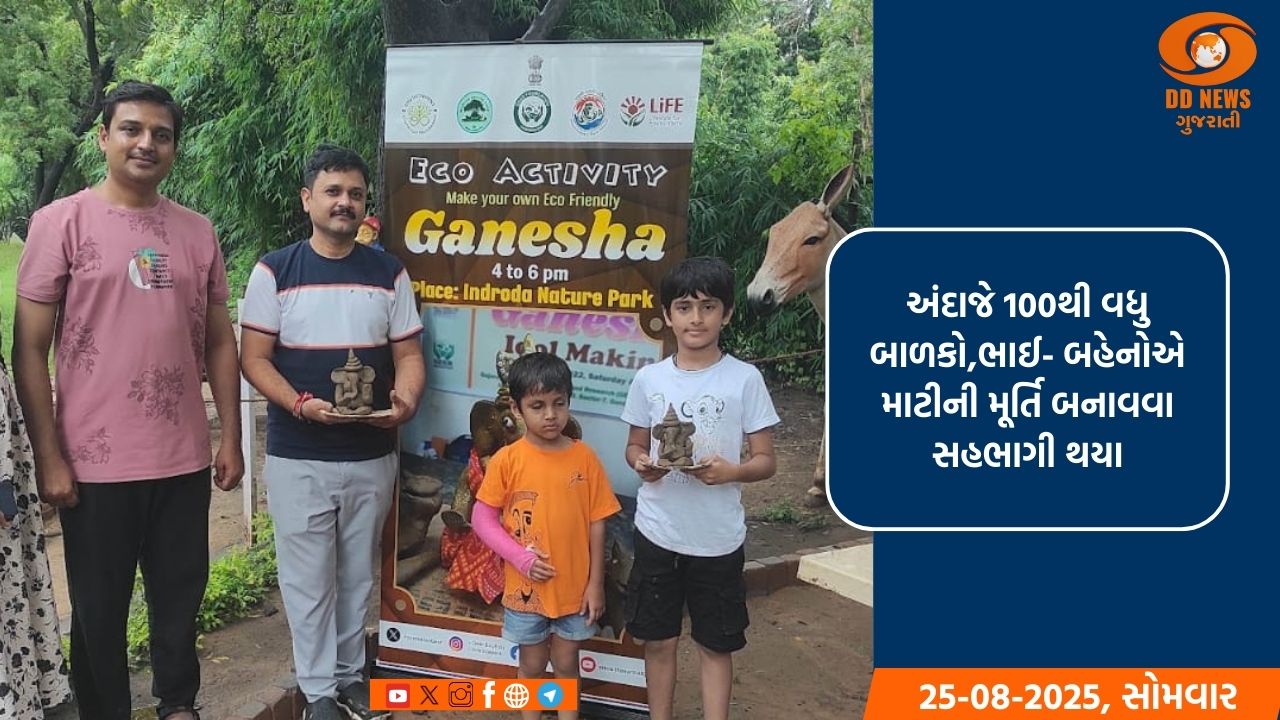 ગાંધીનગરમાં આવેલા ઈન્દ્રોડા પ્રકૃતિ ઉદ્યાન ખાતે બાપ્પાની માટીની ઈકો ફ્રેન્ડલી મૂર્તિઓ બનાવતા શીખવવા અને પર્યાવરણ સંવર્ધન પ્રત્યે પ્રેરણા આપવાનો કાર્યક્રમ યોજાયો હતો. આ કાર્યક્રમમાં આર્ટિસ્ટ દ્વારા બાળકો અને યુવાઓને માટીની મૂર્તિ કેમ બનાવવી તે શીખવવામાં આવ્યું હતું. બાળકો સહિત યુવાઓએ બનાવેલી મૂર્તિઓ ઘરે પણ લઈ જવા આપવામાં આવી હતી. આ કાર્યક્રમ થકી નાગરીકોને પર્યાવરણ અનુકુળ જીવનશૈલી અપનાવવા, તહેવારોમાં ભગવાનની માટીની મૂર્તિઓ બજારમાંથી નહિ પણ જાતે જ બનાવી સ્થાપન કરવા સાથે સાથે પ્રધાનમંત્રીના ‘વોકલ ફોર લોકલ’ના સૂત્રને સાર્થક કરીને સ્થાનિક કલાકારોને રોજગારી સ્વરૂપે પ્રોત્સાહન આપવા અપીલ કરવામાં આવી હતી. આ કાર્યક્રમમાં અંદાજે 100 વધુ બાળકો સહિત ભાઈ- બહેનોએ ઉત્સાહપૂર્વક ગણેશજીની મૂર્તિઓ બનાવવામાં ભાગ લીધો હતો તેમ, ગીર ફાઉન્ડેશનન યાદીમાં જણાવાયું છે.