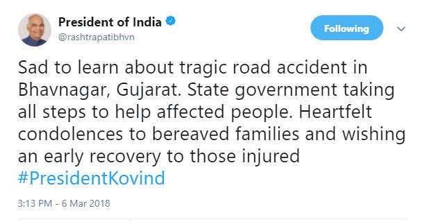 રાષ્ટ્રપતિ રામનાથ કોવિંદે ટ્વીટ કરતા લખ્યું કે, ભાવનગર નજીક થયેલા ગંભીર અકસ્માતના સમાચારથી ખૂબ દુઃખ થયું. ઘટનાનો ભોગ બનેલા લોકોની સહાય માટે રાજ્ય સરકાર તમામ પ્રકારની મદદ કરશે. મૃત્યુ પામેલા લોકોને મારી શ્રદ્ધાંજલિ છે, અને ઇજાગ્રસ્ત થયેલા લોકો જલદીથી સ્વસ્થ થાય તેવી પ્રાર્થના.