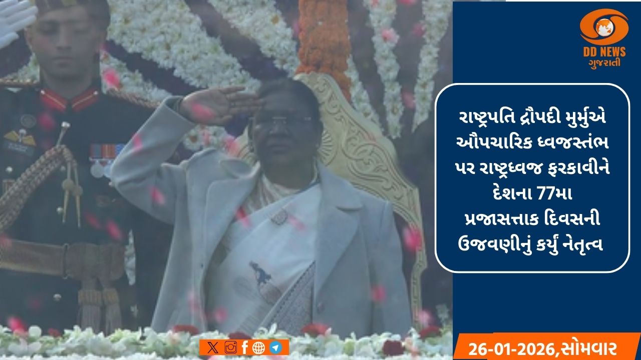 રાષ્ટ્રપતિ દ્રૌપદી મુર્મુએ ઔપચારિક ધ્વજસ્તંભ પર રાષ્ટ્રધ્વજ ફરકાવીને દેશના 77મા પ્રજાસત્તાક દિવસની ઉજવણીનું નેતૃત્વ કર્યું. ત્રિરંગો ફરકાવતાની સાથે જ રાષ્ટ્રગીતના મધુર સૂર ગુંજી ઉઠ્યા અને સ્વદેશી 105mm લાઇટ ફિલ્ડ ગનથી 21 તોપોની સલામીએ વાતાવરણ દેશભક્તિના ઉત્સાહથી ભરી દીધું.