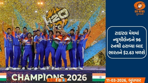 અમદાવાદના નરેન્દ્ર મોદી સ્ટેડિયમમાં રવિવારે રમાયેલી ટી20 વર્લ્ડ કપ 2026ની ફાઈનલમાં ભારતે ન્યૂઝીલેન્ડને 96 રને હરાવીને ઇતિહાસ રચ્યો છે. સતત બીજી અને કુલ ત્રીજી વખત ટ્રોફી જીતીને ભારત વિશ્વની પ્રથમ એવી ટીમ બની છે જેણે ત્રણવાર ટી20 વર્લ્ડ કપ જીત્યો હોય. આ ઐતિહાસિક સફળતા બાદ હવે ટીમ ઇન્ડિયા પર આઈસીસી (ICC) દ્વારા પૈસાનો વરસાદ કરવામાં આવ્યો છે.